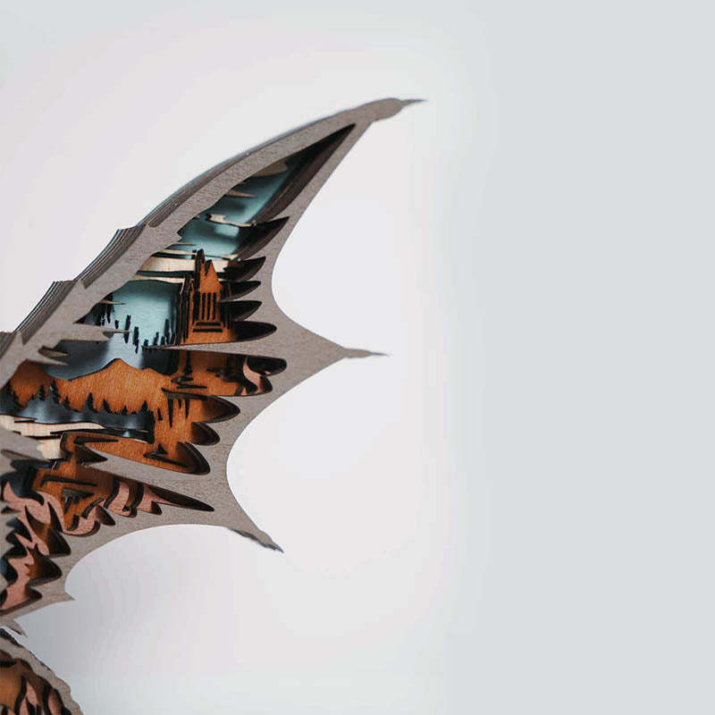Our designer took 3 key words of a western dragon: fire, cliff, forest, as key design elements on this mythological creature with a silhouette of a typical western dragon.