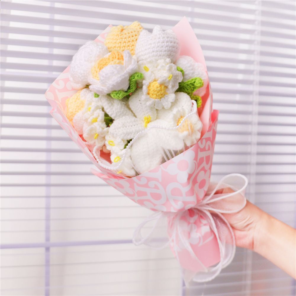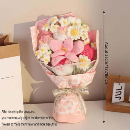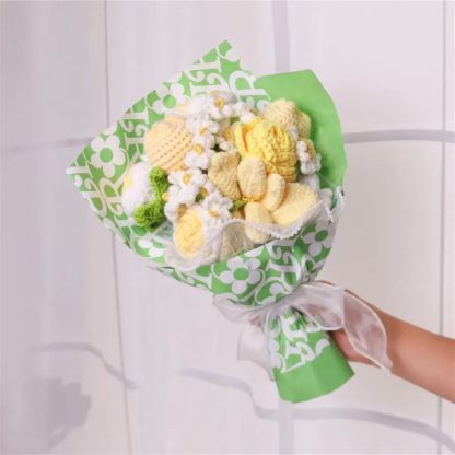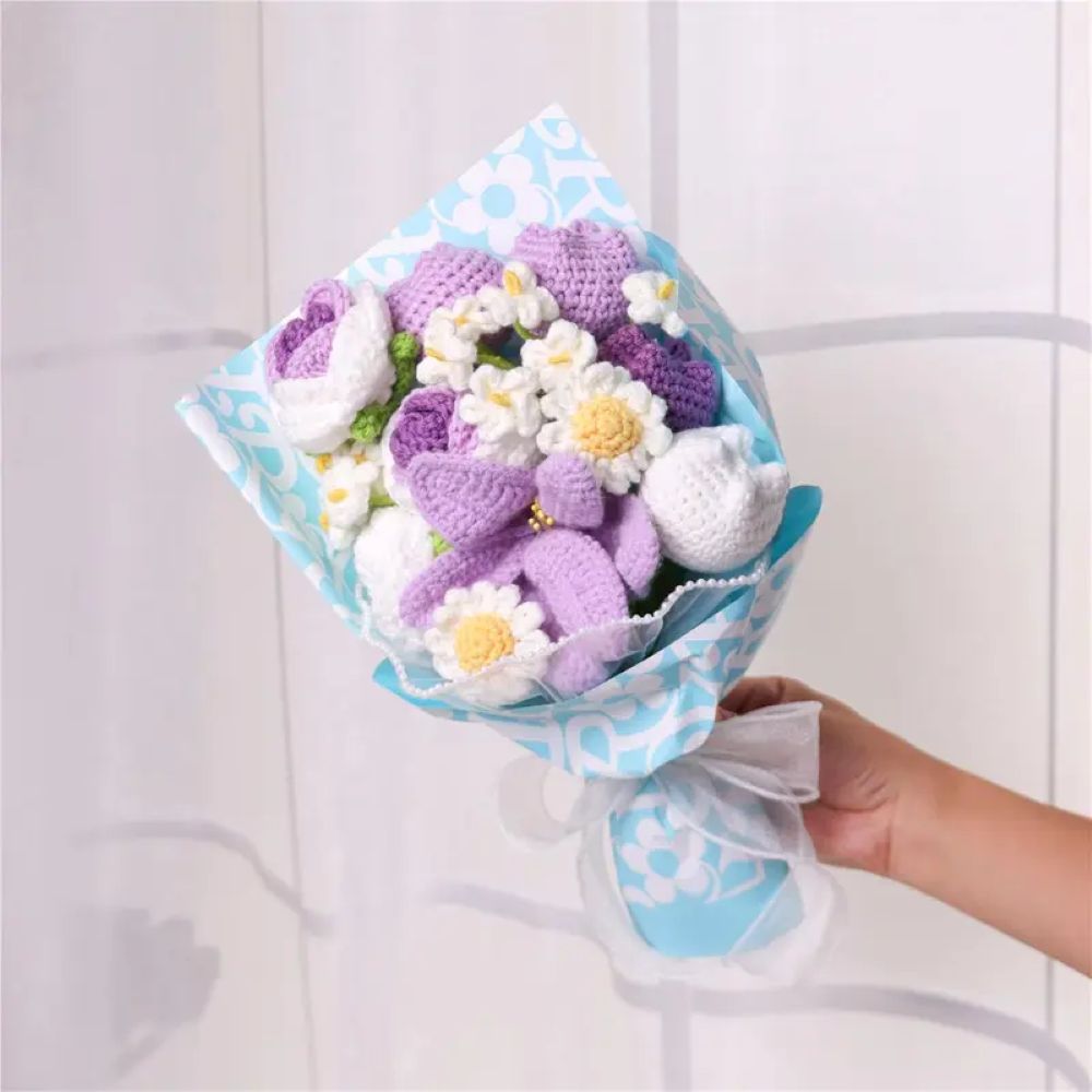 The lifelike crocheted flowers, from graceful daisies to larger, more elaborate blooms, are arranged to mimic the natural allure of a freshly picked bouquet. Wrapped in elegant patterned paper and tied with an elegant ribbon, it is a visual delight that adds a touch of sweetness to any setting.