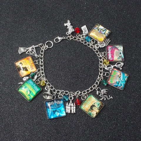Unique charm bracelet inspired by the magical world of Hogwarts and Harry Potter, Designed using authentic recycled Scrabble tiles and featuring the covers from all 7 books in the series!