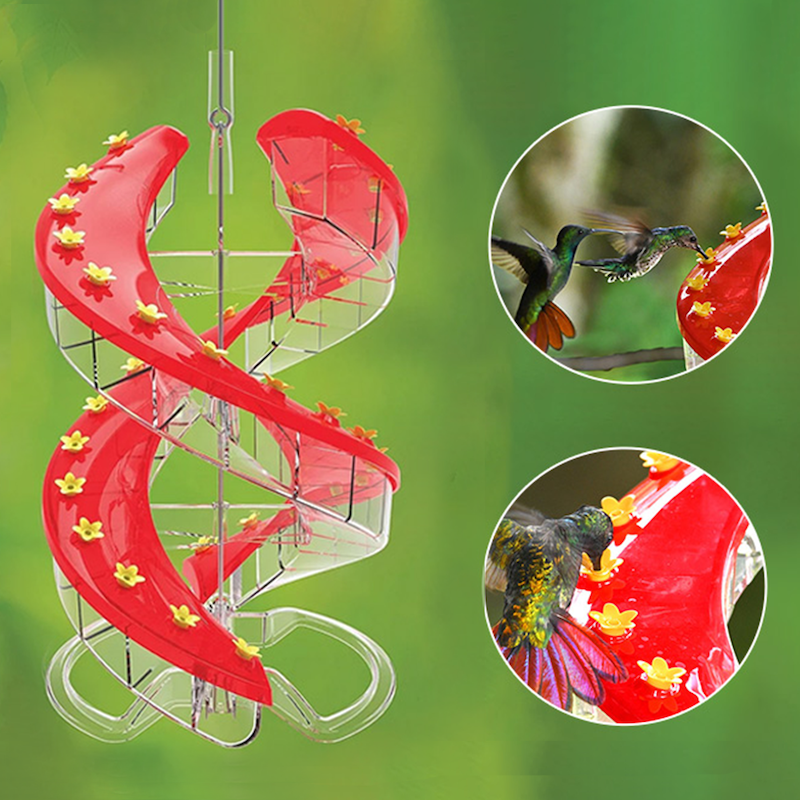 Attracts More Birds. The dramatic design breakthrough provides numerous ports in a compact size. The mesmerizing twisting shape is inspired by DNA strands. The red covers and yellow ports are especially attractive to hummingbirds.