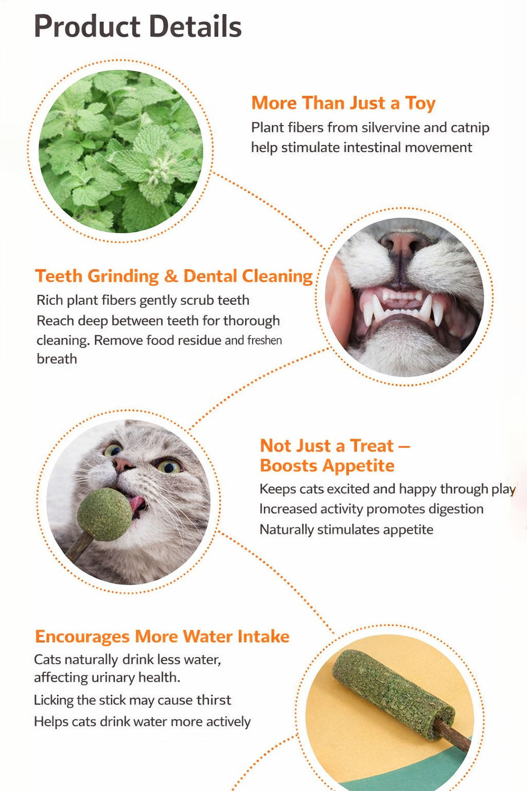 Rich plant fibers gently scrub teeth and reach between gaps, helping remove food residue, reduce plaque buildup, and leave your cat with a naturally fresh, herbal scent.