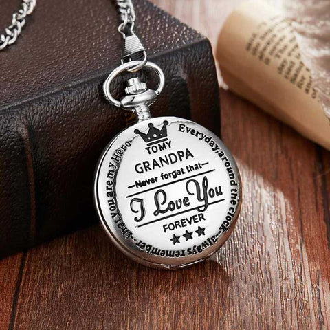 A traditional quartz movement full hunter pocket watch, engraved with the personal message "To My Son/Grandpa/Dad I Love You Forever". This traditional accessory features a elegant white dial, encased within a red, roman numbered dial. The front and back opening case are polished for a lustrous shine, effortlessly releasing to reveal the unique face.
